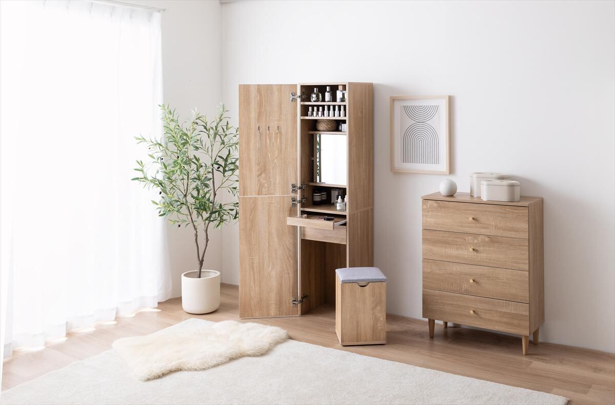 洗練されたデザインと機能性を兼ね備えた『Choa 姿見ドレッサー』です。このドレッサーは、化粧や身支度をする際におしゃれにサポートしてくれます。コンパクトなサイズ感ながら、スッキリとした美しいフォルムがどんなインテリアにもマッチします。