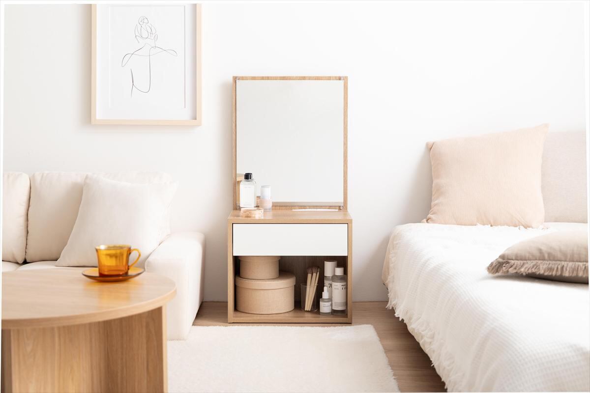 機能美が際立つ『Lino コンセント&引き出し付きロードレッサー』です。このロードレッサーは、狭いスペースでも活躍する幅43cmのサイズで、使い勝手がよく、デスクワークやメイクをする際に便利なコンセントも完備しています。シンプルで洗練されたデザインが、どんなインテリアにも調和します。
