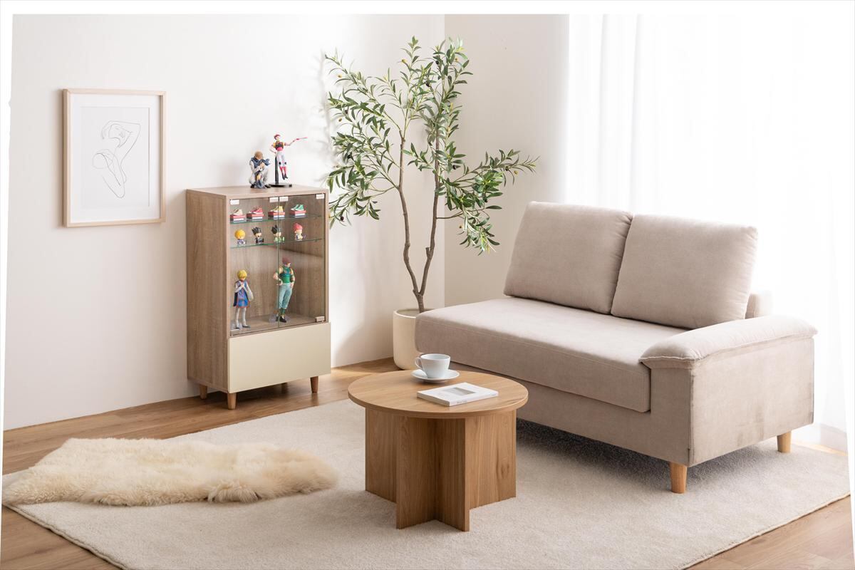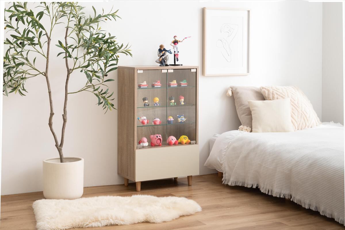 引き出しが付いており、コレクションの小物やお菓子、雑貨などをスッキリと収納できます。また、透明なガラス扉が開くことで、収納したアイテムを美しく見せることができ、インテリアのアクセントとしても大活躍します。シンプルでありながらもスタイリッシュなデザインは、どんな部屋にも調和し、使い勝手も抜群です。