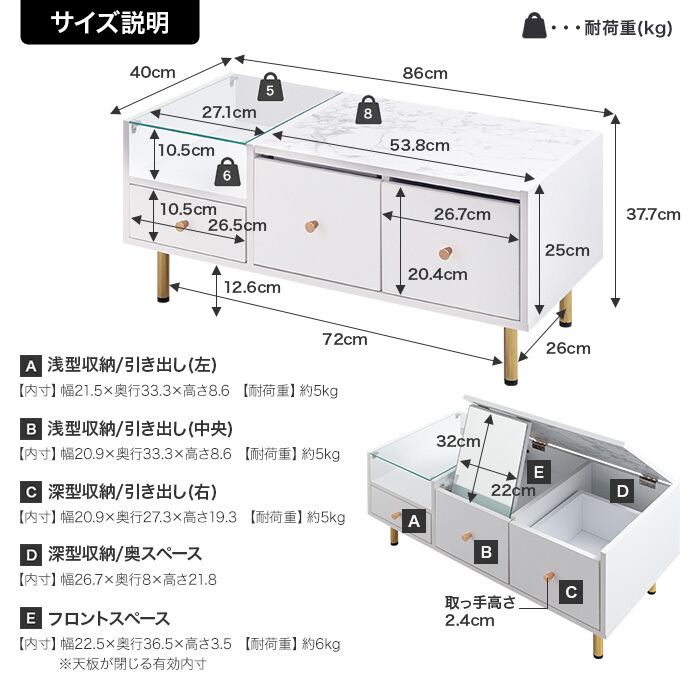 【耐荷重】天板:約8kg、ガラス天板:約5kg、オープン収納:約6kg、引き出し(左):約5kg、引き出し(中央):約5kg、引き出し(右):約5kg、フロントスペース:約6kg