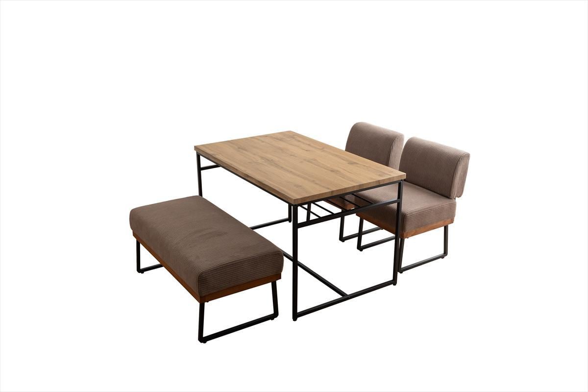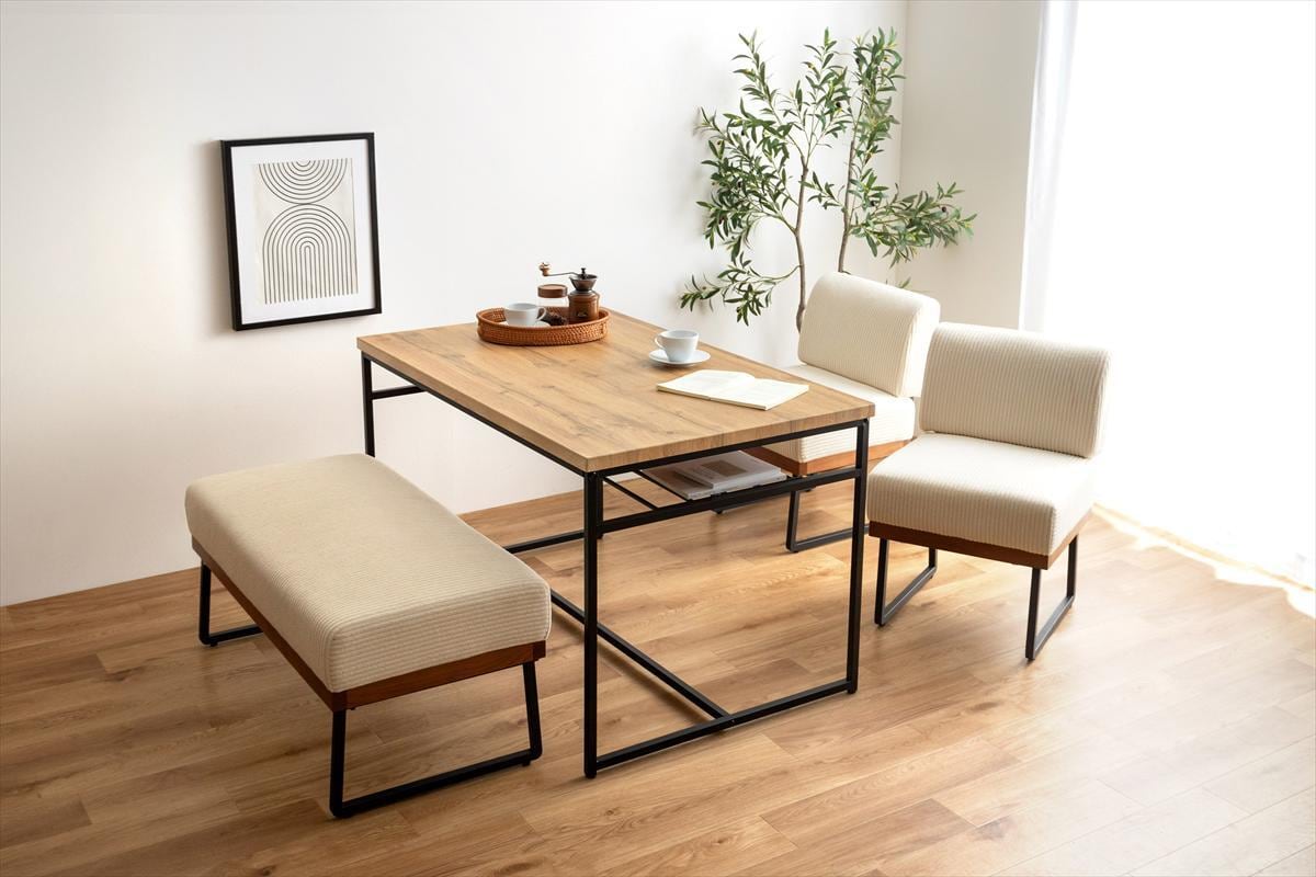 この4点セットには、幅120cmのテーブルと1人掛けソファ2脚、そしてベンチが含まれており、快適でスタイリッシュな食事空間を演出します。テーブル下の棚は、必要なアイテムをすぐに取り出せる便利な収納スペースとして活用できます。ダイニングでの楽しいひとときを、より快適にサポートします。