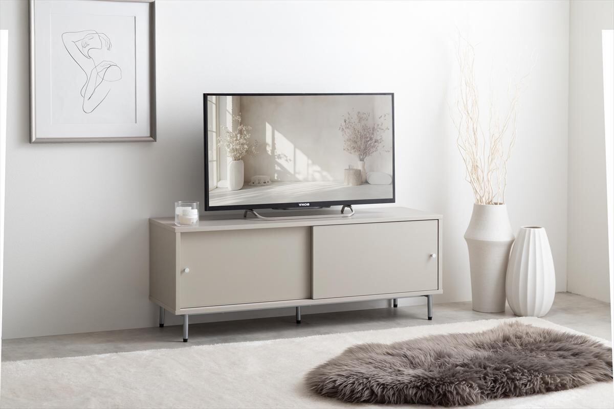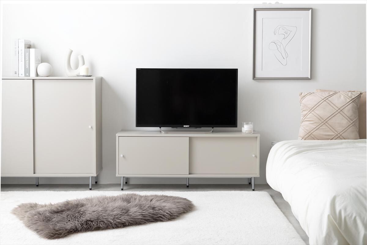 このテレビ台は、引き戸を開ければ広々とした収納スペースがあります。リモコンやDVDなどの小物も簡単に整理でき、日常の使い勝手を向上させます。また、シンプルなデザインはさまざまなインテリアスタイルに調和し、部屋の雰囲気を高めます。
